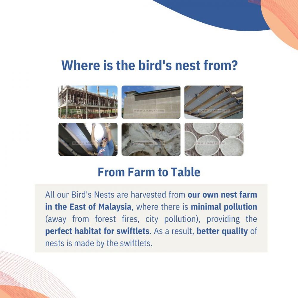All bird's nests are harvested from our own nest's farm in the East of Malaysia where least pollution (away from forest fires, city pollution) is the perfect habitat for the swiftlets. Hence better quality of nests is made by the swiftlet's saliva.