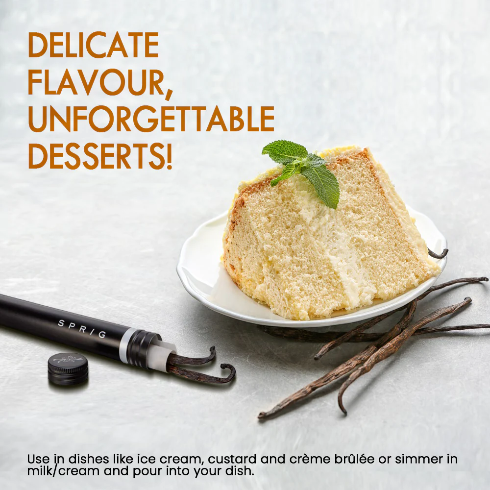 Sprig Vanilla Beans are Premium, Grade A beans sourced from Madagascar. Vanilla pods and the seeds within the pods have flavour. Scrape-out the pods and infuse into milk or cream for a subtle vanilla flavour.No Artificial Flavour, No artificial colors, Fat Free, Gluten Free, No Preservatives Ingredients : Premium Grade A Vanilla Bean