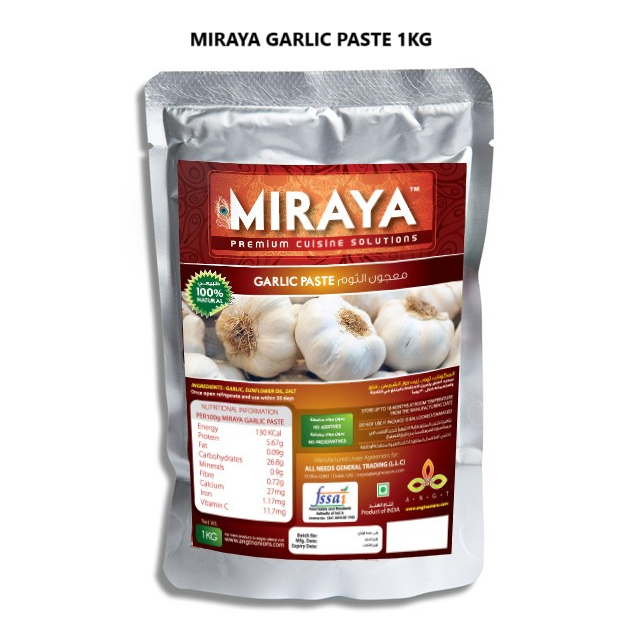 Shelf Life of 24 months at Room Temperature without Refrigeration. Once the pack is opened, it needs to be Refrigerated / Chilled. Ingredients : Garlic, Sunflower Oil, Salt Storage : Room Temperature Weight : 1kg Retort Pouch Carton Packaging : 12units x 1kg packets