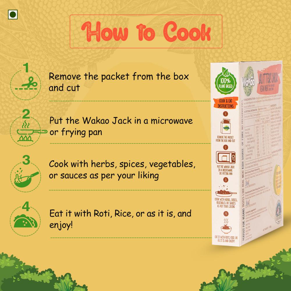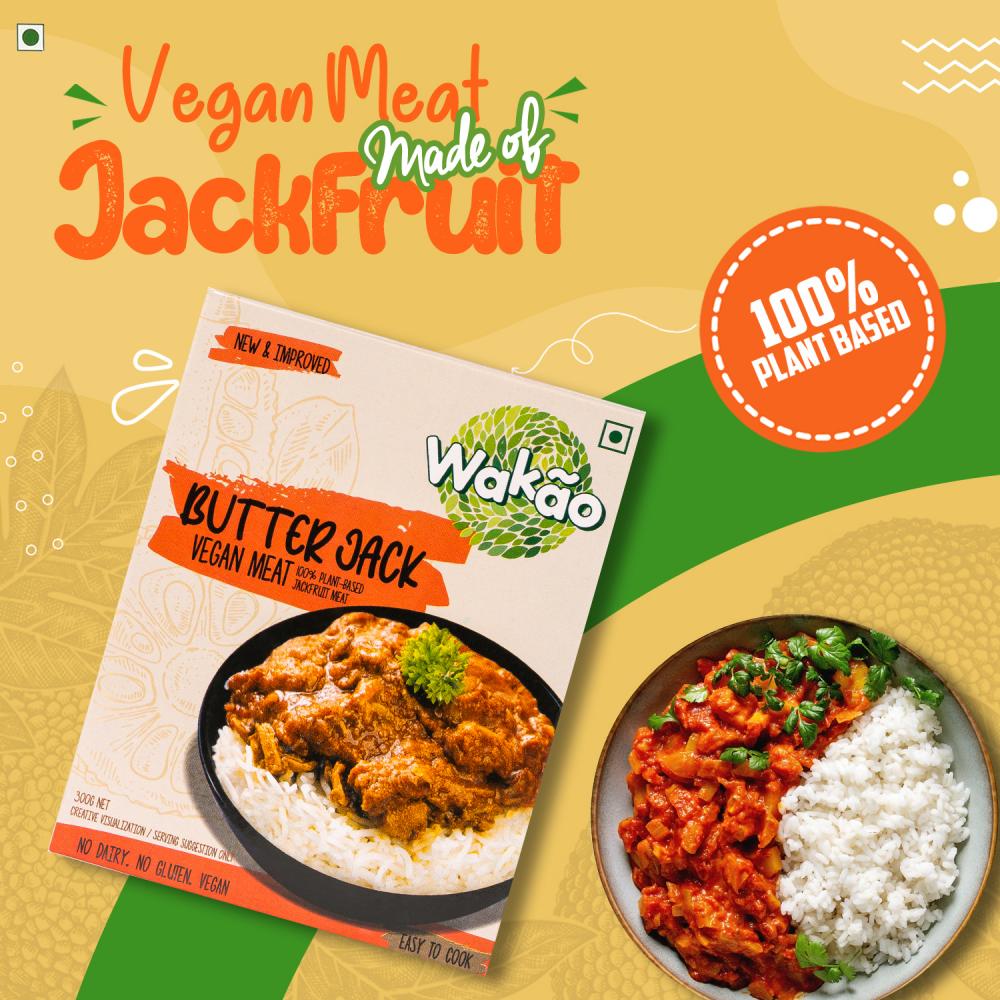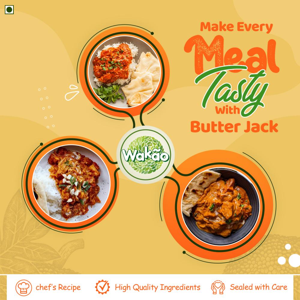 Wakao Butter Jack is a Ready-To-Eat Buttered Jackfruit meats that comes in a retort pouch. This Heat and Eat product is a super easy and convenient way to enjoy a Vegan Butter Chicken. It can also be used as an ingredient for various other dishes like Sandwiches, Wraps, Kebabs, Pizzas, Tacos, Biryanis and many more.