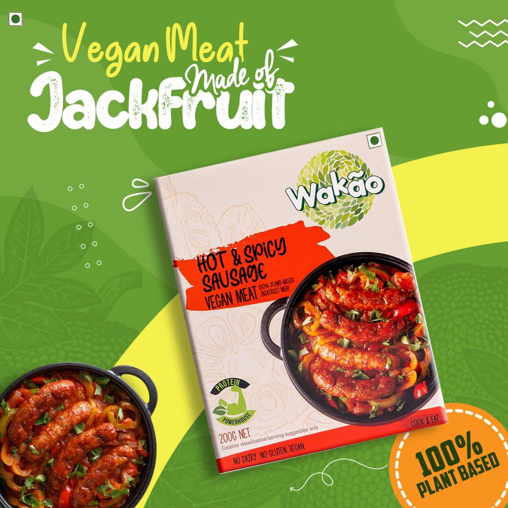 Wakao Hot and Spicy Sausages is a Ready-To-Cook Jackfruit meat sausage that comes packed in a retort pouch. This juicy, flavourful Sausages is a quick and convenient way to make a Spicy Vegan Hot Dog. To enjoy just grill or fry like your regular Sausages. It can also be used as an ingredientfilling or topping for various other dishes like Sandwiches, Wraps, Kebabs, Salads, Pizzas, Tacos and many more.