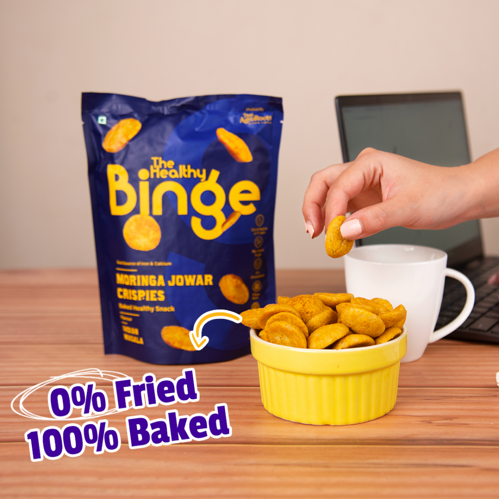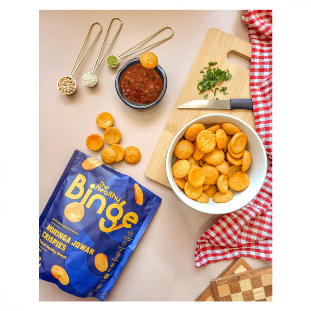 The all-natural Healthy Binge crispies are the ideal snack for a bingeing session. 100% baked, 0% cholesterol and with no added sugar / trans fat, this healthy snack is Vegan, Gluten-Free & Rich in Protein and Fibre. Blended with ultra-flavoursome spices like fennel, bay leaves, peppercorns, cloves, cardamom, cumin, coriander seeds, cinnamon and red chili powder, the Indian Masala has long since been a household favourite. Ingredients :Jowar Flour, Rice Flour, Corn, Potato Powder, Moringa Powder, Vitamin E, Emulsifier INS 170, Sunflower Oil, Salt, Spices,, INS 330, E551, Natural flavouring substances