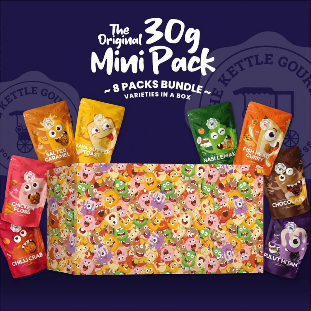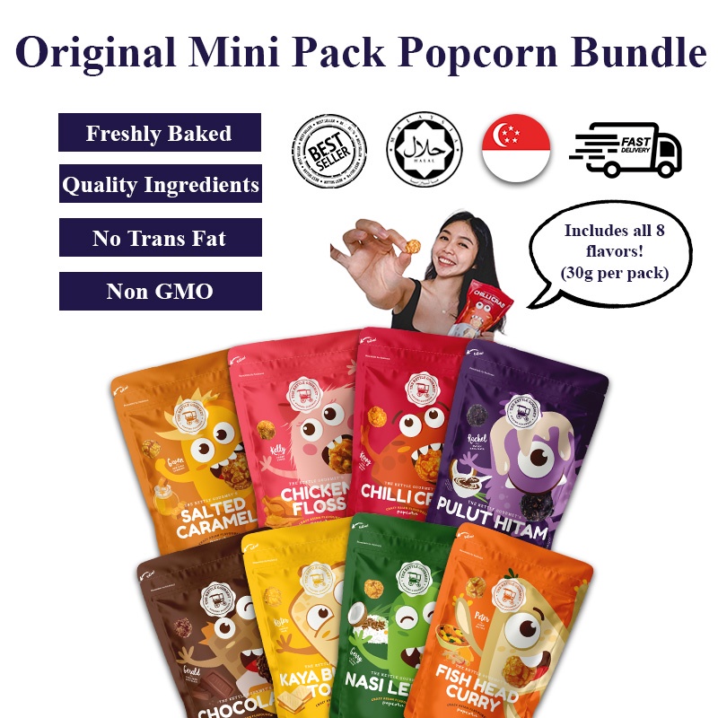 The Original Mini Pack Bundle has 8 mini packets of gourmet popcorn that includes our best selling flavours like Fish Head Curry, Chilli Crab, Chicken Floss, Nasi Lemak, Kaya Butter Toast, Salted Caramel, Pulut Hitam & Chocolate."